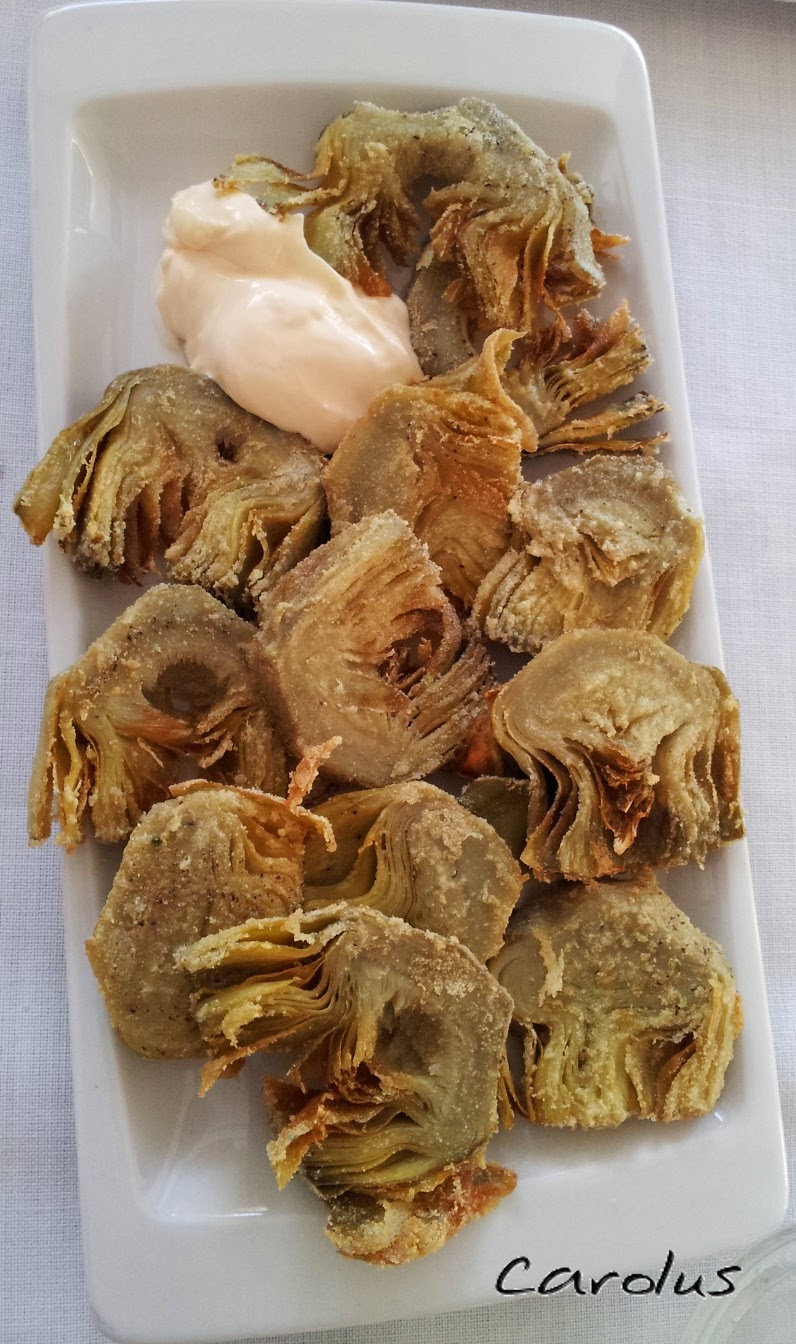 | Alcachofas rebozadas, deliciosas, con un ligero sabor a pimienta, super tiernas (supongo que las cocerían antes de rebozar) un éxito total |