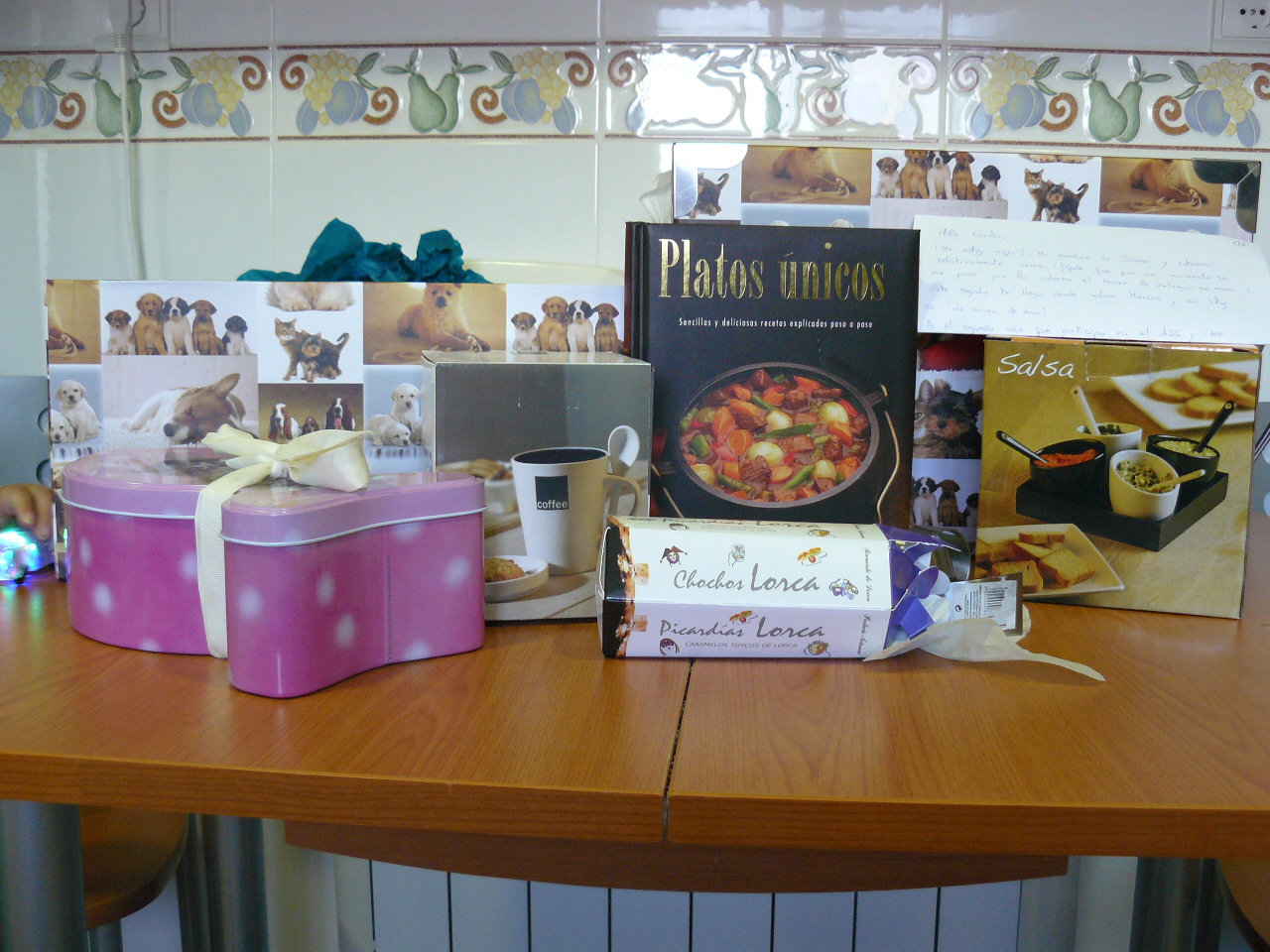 Un dia estaba en el trabajo y me dijo mi mujer, «te ha llegado un paquete de Lorca de una tal Juani» y yo le dije que eso sería el regalo de mi AIG, asi que me metí en google y puse «blog+juani+lorca» y el primer resultado era La cocina de Xua, asi que antes de llegar a casa y abrir el paquete ya sabía de quien era.