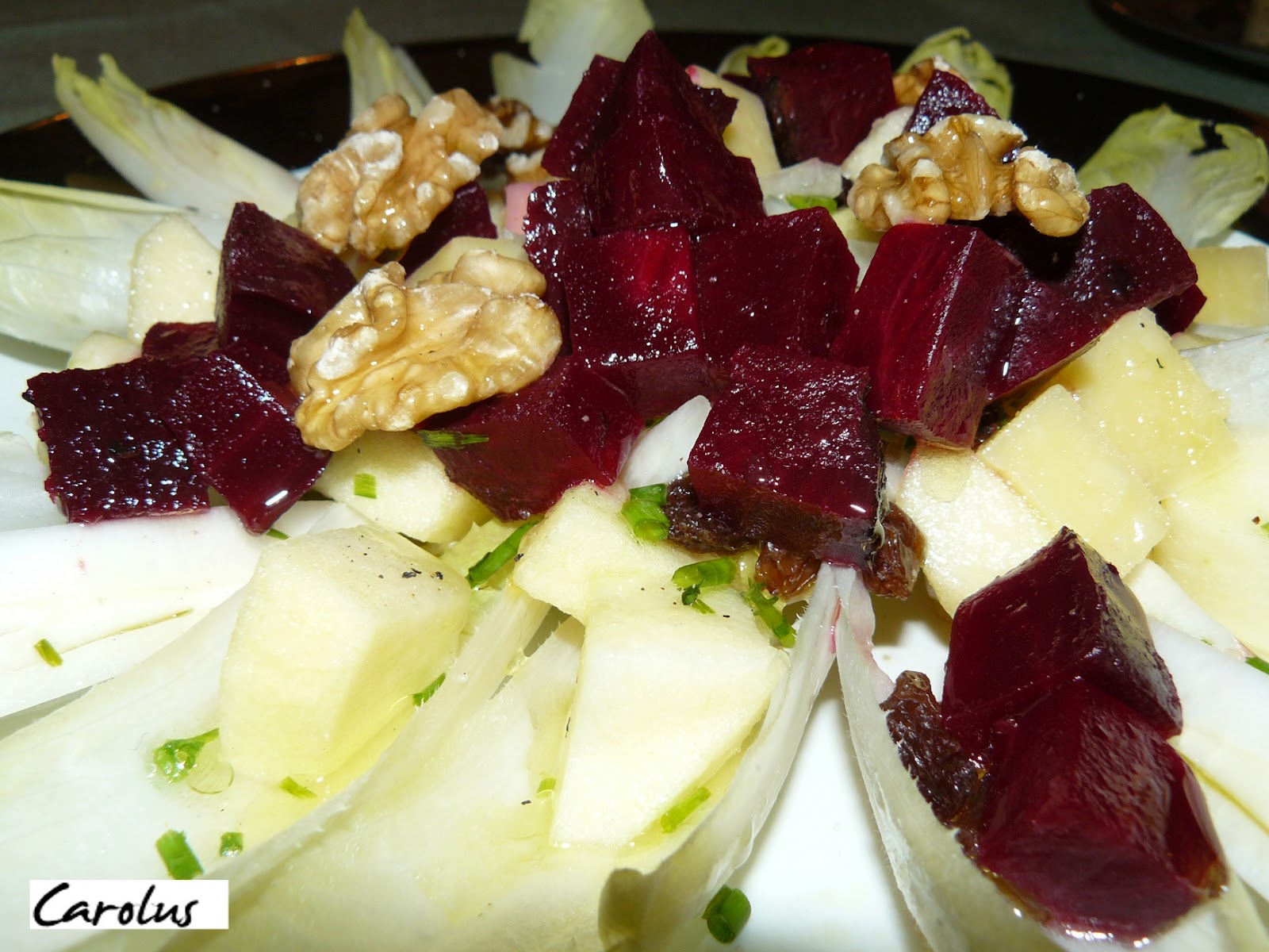 Ya sentados en la mesa y con vino en las copas, empezaron a traer los platos, empezamos con la Ensalada de Invierno, una combinación delicada y muy sabrosa, una vinagreta con cebollino regaba las endivias, manzana, queso, remolacha, nueces y pasas.